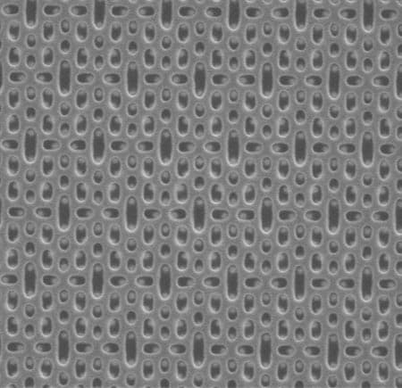 На второй иллюстрации показан массив ячеек SRAM после завершения одного из этапов техпроцесса. Площадь одной ячейки составляет 0,099 кв.мкм, что вдвое меньше, чем площадь такой же ячейки, изготовленной с соблюдением норм 32 нм.