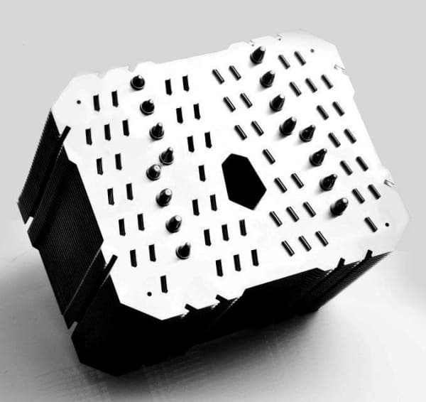 Судя по фото, новинка будет ориентироваться на любителей бесшумных и пассивных систем охлаждения. Количество тепловых трубок равно восьми, а пластины радиатора имеют достаточно сложную форму.