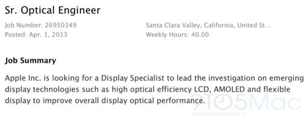 Итак, производителю планшетов iPad и смартфонов iPhone понадобился специалист в области технологий дисплеев с опытом работы, который мог бы возглавить исследования передовых технологий дисплеев, в частности, направленных на улучшение оптических характеристик жидкокристаллических панелей, панелей AMOLED и гибких дисплеев.