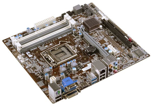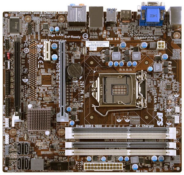 Системная плата характеризуется типоразмером microATX (размеры — 244 х 220 мм). В ее конфигурацию вошли четыре слота для модулей оперативной памяти DDR3, два слота PCI Express х16 (на второй приходится только четыре линии интерфейса), один PCI Express х1. Для подключения накопителей предусмотрено шесть портов SATA 6 Гбит/с.