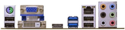 Разводка портов на интерфейсной панели ECS Z97-PK продемонстрирована на фото ниже, на самой плате предусмотрены разъемы для вывода последовательного и параллельного портов, а также дополнительных портов USB 3.0 (два) и USB 2.0 (шесть).
