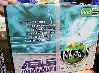 Первыми в японской рознице появились платы A7M266-D от ASUS. Двухпроцессорная АТХ плата A7M266-D с четырьмя слотами под DDR SDRAM память котируется в настоящее время примерно в 32800 иен ($270).
