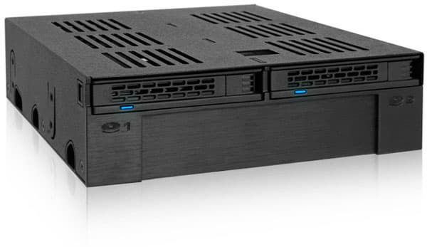 Корзина ExpressCage MB322SP-B превращает отсек типоразмера 5,25 дюйма в отсек типоразмера 3,5 дюйма и два отсека типоразмера 2,5 дюйма. Причем отсеки типоразмера 2,5 дюйма в ExpressCage MB322SP-B поддерживают горячую замену накопителей. В них помещаются HDD и SSD высотой 7 или 9,5 мм с интерфейсом SATA или SAS.