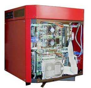 RenderCube от одноименной компании, которая представляет собой 4 двухпроцессорных системы со своими жестими дисками и 300 Вт блоками питания, которые объединены 4-х портовым KVM коммутатором и имеют один CD-ROM, клавиатуру и мышку на всех. Причем материнские платы используются стандартные, ATX-формата, под PIII.