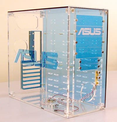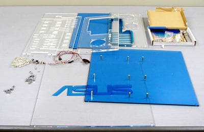 В комплект поставки ASUS-TPA-CHASSIS входит все необходимое для сборки корпуса для ПК на базе системной платы форм-фактора ATX. Корпус скомбинирован из прозрачных элементов разноцветного акрилового пластика. Разумеется, в комплекте поставляется набор светодиодных подсветок логотипа ASUS и различных элементов системы.