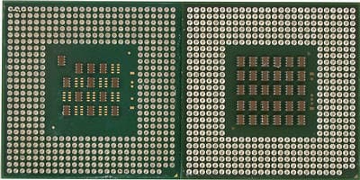 Наша тестовая лаборатория сегодня получила в свое распоряжение тот самый уникальный процессор Intel – 3,2 ГГц Pentium 4 Extreme Edition. Правда, отсутствие маркировки на лицевой части не дает никаких оснований предположить, что именно так оно и есть, зато это хорошо видно со стороны контактов (на третьем фото справа — Extreme Edition, слева — обычный 3,2 ГГц Pentium 4):