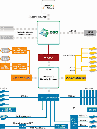 Впервые показанный компанией VIA Technologies еще в сентябре 2003 года, новый чипсет Apollo KT880 с поддержкой двухканальной памяти DDR, предназначенный для системных плат под процессоры AMD Athlon XP, наконец-то представлен официально. Новый северный мост будет комплектоваться южным мостом VIA VT8237.