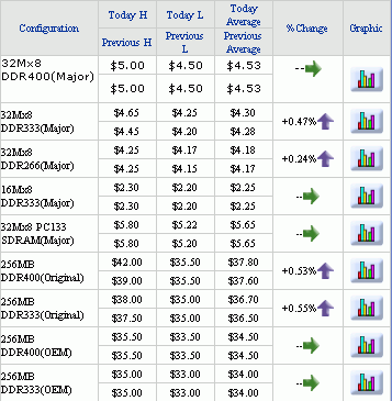 За последние сутки спекулятивный рост цен на DDR SDRAM продолжился; однако в результате четырехдневной чрезмерной активности трейдеров цена микросхем 32x8 DDR SDRAM не успела подняться слишком высоко и находится в пределах "сезонной нормы". Как отмечают обозреватели, на самом деле, упомянутые во вчерашнем обзоре сообщения о TSMC сыграли свою роль и основным фактором, влияющим сейчас на принятие трейдерами решений, является положительный прогноз по рынку.