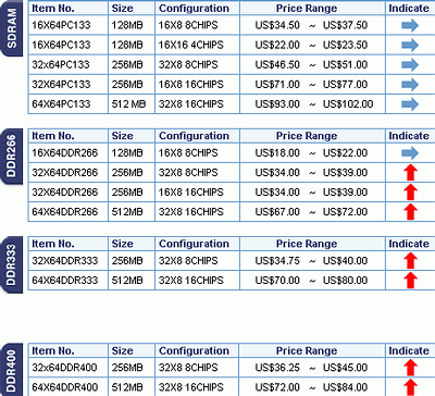 Еще раз стоит отметить, что цена маркеров начала увеличиваться: 32Mx8 микросхемы DDR266/333 Hynix подорожали до $4.20/$4.24 за штуку, цена DDR400 зафиксировалась на уровне $4,50. В секторе SDR SDRAM по-прежнему пристальное внимание уделяется чипам 1Mx16/4Mx16/16Mx16; цена микросхем низкой плотности продолжает повышаться, высокой плотности – относительно стабильна.