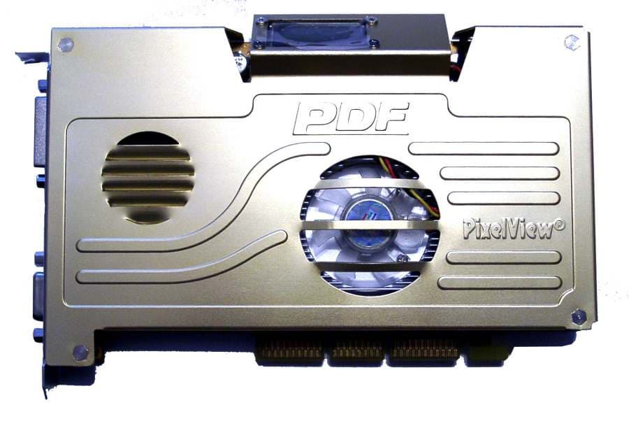 Карта интересна наличием кулера оригинальной конструкции с синей подсветкой, а также системы контроля PDF (Plasma Display Fan), за что и получила в названии эту добавку. Система охлаждения с индикатором Blue Icy Crystal Displayer (синяя подсветка) позволяет вести мониторинг за температурой графического чипа и скоростью вращения кулера, а также оповещать звуковыми сигналами о проблемах с перегревом. Вентилятор охлаждающей системы создает поток до 5.9 CFM при скорости вращения до 5000 об/мин. Аудио оповещение включается в случае, когда скорость вращения вентилятора снижается ниже 1000 об/мин или температура чипа превышает 70°C.