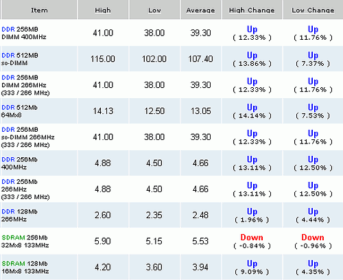 Оригинальные 256 Мб модули подорожали на 19,26% — до 54,5 доллара в случае DDR400 SDRAM и на 21,11% — также до 54,5 доллара в случае DDR333 SDRAM. OEM модули DDR400 SDRAM (256 Мб) подорожали на 21,69% — до 50,50 доллара, DDR333 – на 18,07% — до 49 долларов.