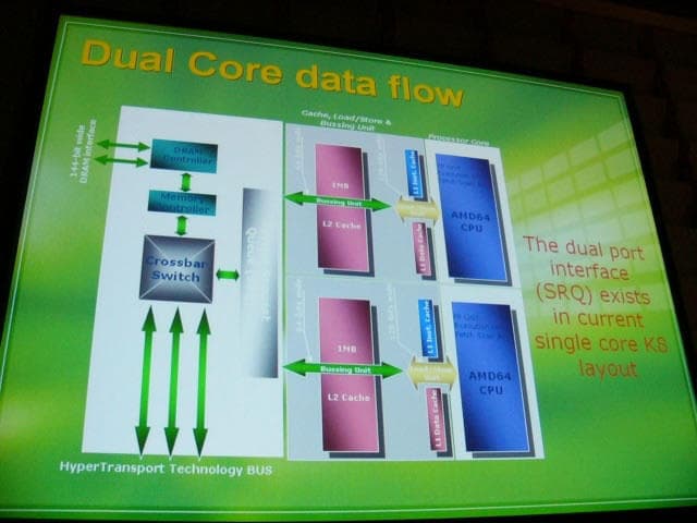 Компания AMD, судя по сообщениям различных источников, в частности, Mycom PCWEB, работает над процессором Opteron с двумя ядрами, более того, эти Opteron будут полностью совместимы с существующими системными платами, так что владельцы плат с двумя процессорными гнездами смогут сменить используемые процессоры на модели с двумя кристаллами и получить "четырехпроцессорную" систему. Стоит обратить внимание и на тот факт, что новые версии Opteron будут иметь независимый 1 Мб кэш: (щелкните по картинке для получения изображения большего разрешения)