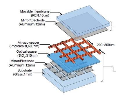 Предлагаемый учеными дисплей состоит из прозрачной пластиковой мембраны и нескольких металлических мембран. Две из этих мембран управляются электрическим полем, формируя изображение (пиксели) в точках соприкосновения. Причем в точках соприкосновения излучается свет строго определенной длины волны, так как дополнительно пропускается через интерферометр Фабри-Перо. Самое главное преимущество новой технологии – простота производства экранов, размер которых ограничен лишь размерами «прокатного стана», из которого выходит описанная выше мембранная структура.