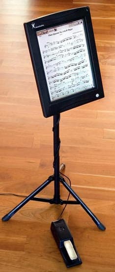 По сути дела, это не только «подставка для нот», но и нотная тетрадь, и библиотека записей музыкальных произведений. По данным источника, в памяти устройства, представляющего собой планшетный компьютер, можно сохранить партитуры нескольких тысяч композиций. Планшет оборудован 12-дюймовым (разрешение - 1024 x 768 пикселей) сенсорным экраном. «Перелистывание» страниц выполняется прикосновением к экрану или при помощи ножной педали. Для ввода нот можно воспользоваться ПК и сканером (поддерживается формат PDF и JPG). Партитуры в электронном виде можно купить в онлайновом магазине или перенести из программы для занятий музыкой.