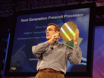 В настоящий момент проходит второй кейноут, посвященный базовым клиентским. Итак, впервые был официально упомянут Prescott и даже продемонстрирована готовая пластина с чипами. Главный по клиентам и настольным платформам - Луи Бернс: