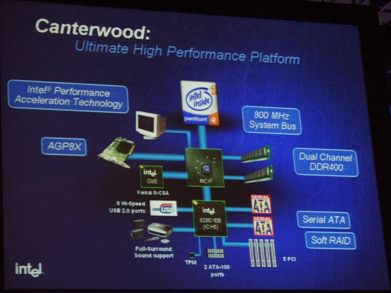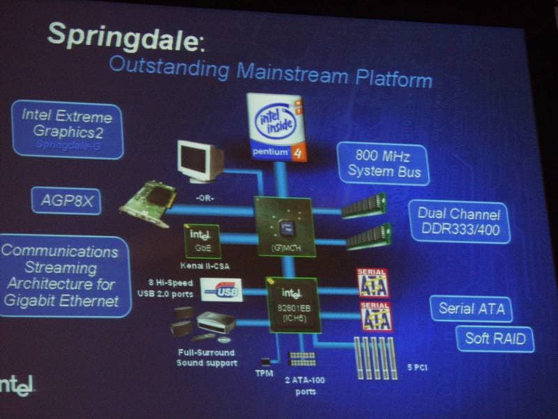 Были также упомянуты несколько новых чипсетов и платформ (производительный Canterwood и мейнстрим Springdale), которые будут запущены в массовое производство в 2003 и начале 2004 года: