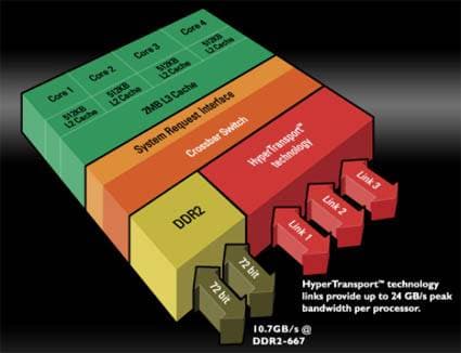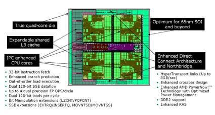 Первый 4-ядерный процессор Barcelona, предназначенный для серверов и рабочих станций, будет опережать, как отмечается, процессоры Intel Xeon 5300-series (Clovertown) на 50% в приложениях с плавающей запятой и примерно на 20% в операциях с целочисленными вычислениями. Утверждается, что это будет самый производительный 4-ядерный процессор на рынке при равной частоте с аналогами.
