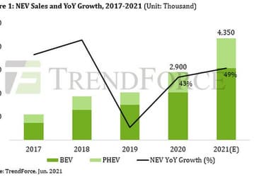 По прогнозам TrendForce, продажи NEV в 2021 году достигнут 4,35 млн штук