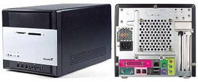 On the back panel: 2 x USB.0 ports, 1 x IEEE1394a, keyboard and mouse PS/2 ports, 1 x RJ45, 1 x COM, 1 x LPT, etc. The aluminium case is sized 295x200x180mm and weighs 2.85 kg.
