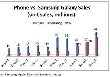 По суммарному количеству продаж Apple iPhone уверенно превосходит Samsung Galaxy