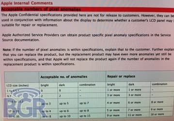 В Сеть попал конфиденциальный документ Apple с нормами пикселей с дефектом в дисплеях различных устройств