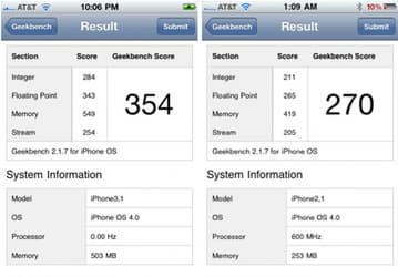 По результатам Geekbench 2 iPhone 4 быстрее iPhone 3GS на 31%