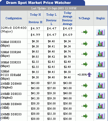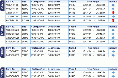 Проходящие выставки и конференции, а также неопределенность с ценой и темпами принятия рынком DDR 2 сдерживают цены на DDR SDRAM на спотовом рынке. И хотя в течение последних двух дней в Гонконге и Китае (имеется в виду континентальная часть) на утренних торгах начинался рост цен на модули этого типа, на полуденных торгах рост прекращался и цена опускалась до уровня на момент открытия торгов. На фоне неменяющегося спроса на DDR, стоит отметить рост спроса на SDRAM. Определяется он, помимо всего прочего, дальнейшим снижением поставок этой памяти на спотовый рынок.