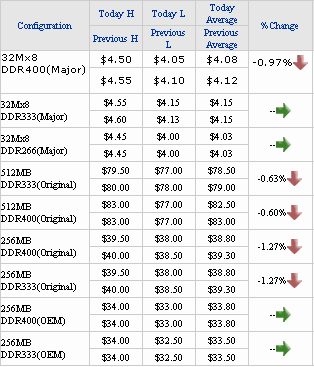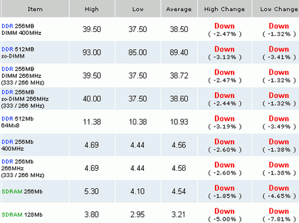 На спотовом рынке маркеры, 256 Мбит (32x8) компоненты DDR 266/333/SDRAM остались на прежнем уровне (4,03 и 4,15 доллара), в то время как цена компонентов DDR400 SDRAM опустилась на последних торгах на 0,97% до 4,08 доллара. Цена нетестированных микросхем составляла сегодня на открытии торгов в среднем 3,90 доллара. При таком положении дел можно прогнозировать дальнейшее снижение цен компонентов памяти на спотовом рынке. Продолжается снижение цен на модули памяти – оригинальные 256 и 512 Мб DDR333/400 SDRAM DIMM, причем, тенденция отмечена не только на азиатских биржах, задающих темп рынка, но и в США.