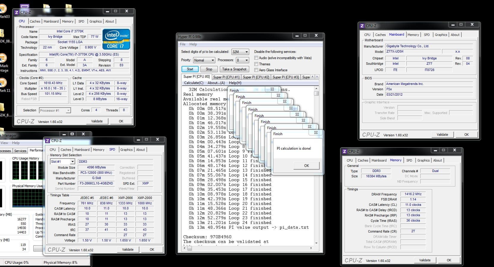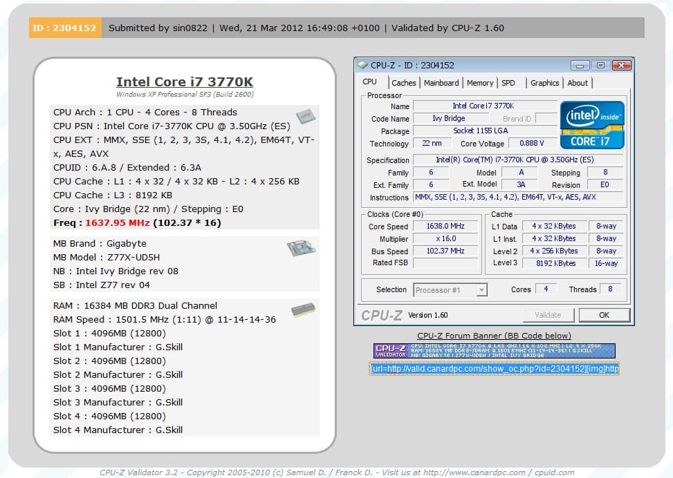 В состав стенда на системной плате GIGABYTE Z77X-UD5H входил процессор Intel Core i7-3770K (Ivy Bridge) и модули памяти производства G.Skill. По словам энтузиаста, процессор Ivy Bridge был выбран из-за возможности установить значение делителя 29,33 — в Sandy Bridge это невозможно. Для достижения желанной отметки, базовая частота была слега приподнята — со 100 МГц до 102,37 МГц. На тактовой частоте памяти 1501,5 МГц (эфф. 3003 МГц) стабильности системы хватило на запуск CPU-Z. Более стабильную работу, необходимую для выполнения стресс-тестов, удалось получить, снизив частоту до 1416 МГц.