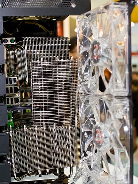 В этом году ThermalRight тоже есть что показать. Новая модель, корпус HSC-101, выполнен по тому же принципу (большие радиаторы, тепловые трубки) и может обеспечить отвод тепла от нагревающихся компонентов компьютера в количестве до 150 Вт каждой из двух сторон.