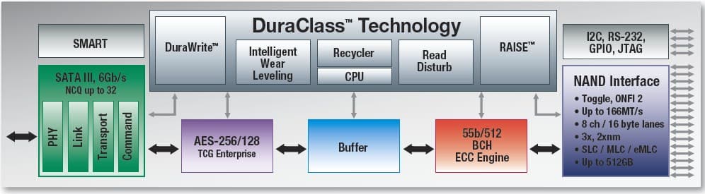 Прошивка готовых устройств может гибко конфигурироваться под требования целевой аудитории, будь-то использование в индустриальных системах, бизнес приложениях или потребительских SSD. Контроллер поддерживает шифрование по алгоритму AES с ключами длиной 128 и 256 бит, механизм коррекции ошибок ECC, режимы троттлинга для снижения энергопотребления и может работать в широком температурном диапазоне от -0 до 85°С.