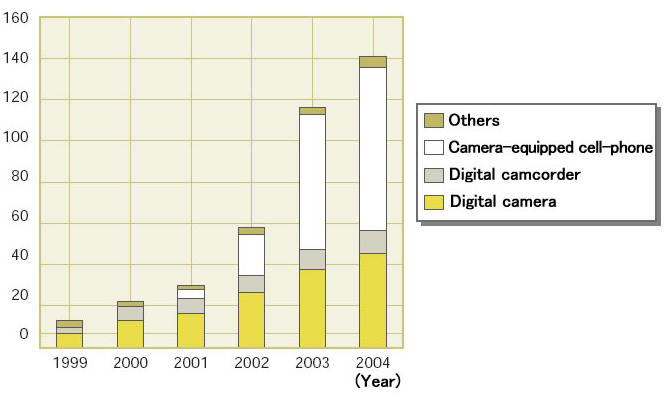 Для начала обратимся к основному сектору использования чипов флэш-памяти, рынку флэш-карт. По оценкам аналитиков в 2003 году на мировой рынок будет поставлено около 100 млн. карт флэш-памяти, а в дальнейшем это количество может увеличиться. Основным фактором роста поставок, как мы уже отмечали, цитируя индустриальные источники, является рост популярности цифровых камер и мобильных телефонов, оснащенных камерами. Продажи таких решений в 2004 году предположительно могут составить 100 млн. штук.