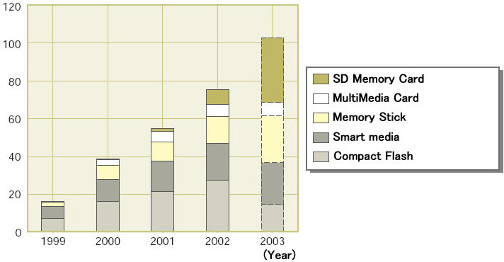 При оценке рынка флэш-карт, аналитики отмечают, что наибольший темп роста рыночной доли показали карты SD, поставки этих карт в 2003 году могут вырасти до 33,7% (именно эти карты используются в качестве сменных носителей в цифровых камерах и мобильных телефонах).