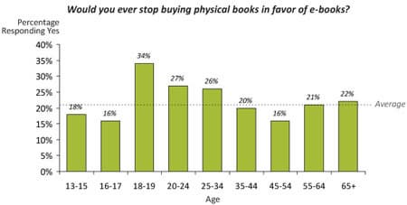 Одной из основных моделей бизнеса может стать распространение материалов по подписке. Результаты проведенного опроса, показанные на иллюстрации, говорят о том, что примерно пятая часть потребителей планирует отказаться от покупки бумажных книг. Одним из «двигателей» перехода на электронные книги выступят студенты и учащиеся.