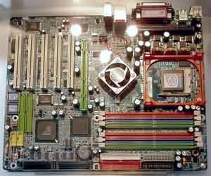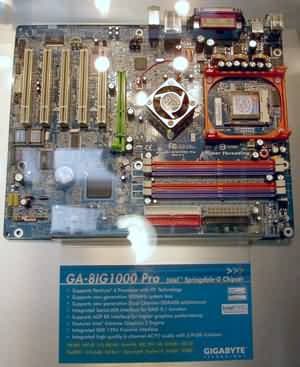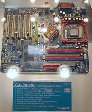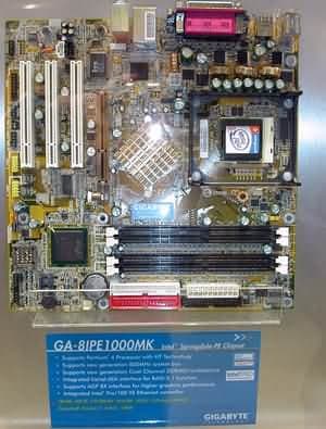Теперь – несколько слов о новых системных платах компании. Разумеется, представлено великое множество вариантов на новых чипсетах от Intel - Canterwood и Springdale. Например, GA-8KNXP Ultra на чипсете Canterwood: