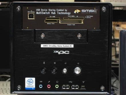В апреле мы сообщали о создании компанией SMSC технологии MultiSwitch, позволяющей нескольким ПК получать доступ к USB-устройствам друг друга. Компьютеры, оборудованные MultiSwitch-хабами, соединяются между собой с помощью, опять-таки, USB-кабеля, после чего все USB-устройства (подключённые к MultiSwitch) становятся общими. В отличие от предоставления доступа по сети, эта технология позволяет «делиться» такими устройствами, как например, сканер или видеокамера.На днях SMSC показала прототип MultiSwitch, размещённый в 5,25" отсеке.