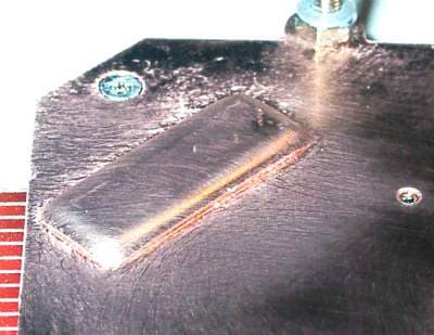 Тот же эксперимент был проведен с графической картой ASUS V9950 на чипе GeForce FX 5900 Ultra. Правда тут, в силу специфики системы охлаждения (она у карты ASUS V9950 общая для чипа и памяти) после снятия крышки выяснилось, что радиатор стал недоставать до чипа из-за имеющихся на нем выступов под микросхемы памяти (обратите внимание на фото с крупным планом выступа на радиаторе).