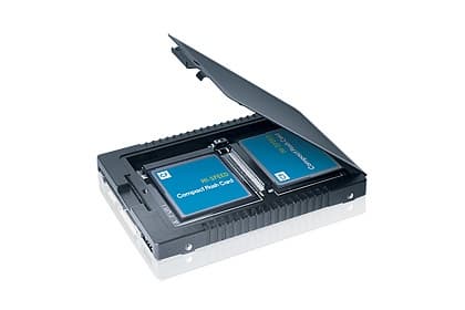 Компанией Sans Digital выпущен свой вариант адаптеров для карт флэш-памяти Compact Flash. Корпус CompactSTOR CR2T предназначен для установки одной или двух карт такого типа, что позволяет не только сделать таким образом внешнее хранилище данных с интерфейсомSATA или IDE, но и получить RAID1-систему.