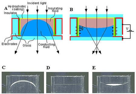 Когда на гидрофобном покрытии изменяется электрический потенциал, происходит частичное смачивание (electrowetting) – компенсация сил поверхностного натяжения силами электрического притяжения. Варьируя потенциал, можно добиться плоской и даже вогнутой формы преломляющей поверхности, играющей роль линзы.