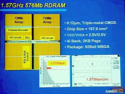 В частности, представитель Samsung рассказал о том, что компания уже имеет рабочие образцы чипов 576 Мбит чипов, работающие на тактовой частоте 1,57 ГГц. Чипы изготавливаются с применением 0,12 мкм технологии.