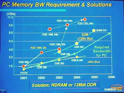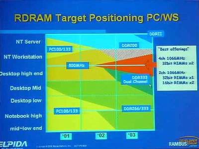 На конференции выступил представитель компании Elpida, который также обрисовал перспективы развития RDRAM до 2004 года. Именно тогда Elpida намерена "добраться" до выпуска PC1333 RDRAM.