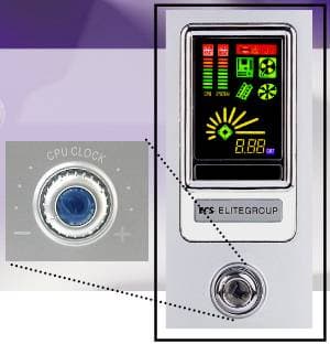 Любопытным образом в системе реализован разгон процессора: с помощью специального вращающегося регулятора можно увеличить или уменьшить FSB системной шины, при этом, изменения тактовой частоты и температуры отображаются на ЖК панели аппаратного мониторинга.