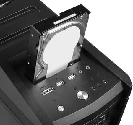 Интересная новинка появилась в каталоге компании Sharkoon. Корпус для ПК типоразмера ATX с нетипичным для компьютерных продуктов названием Bandit имеет встроенную стыковочную станцию для жестких дисков.Наличие дока позволяет быстро подключать и отключать накопители типоразмера 2,5 и 3,5 дюйма с интерфейсом SATA.