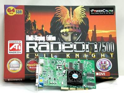 Карта, как видно из названия, выполнена на графическом чипе ATI Radeon 7500LE, работающем на частоте 250 МГц и оборудована 64 Мб памяти SDRAM, работающей на частоте 230 МГц, и DVI выходом. Ожидаемая цена PowerColor EVIL KNIGHT RADEON 7500LE - порядка FF600 ($82).