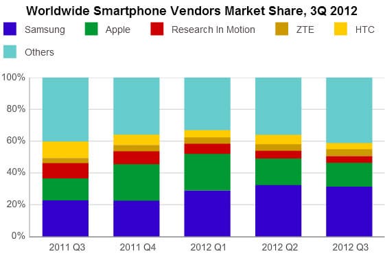 На втором месте находится компания Apple, которой принадлежит 15,0% рынка, на третьем — Research In Motion (4,3%), на четвертом — ZTE (4,2%). Замыкает пятерку компания HTC с долей в размере 4,0%. Компания Nokia, долгое время бывшая бессменным лидером рынка, в этом квартале покинула первую пятерку поставщиков.