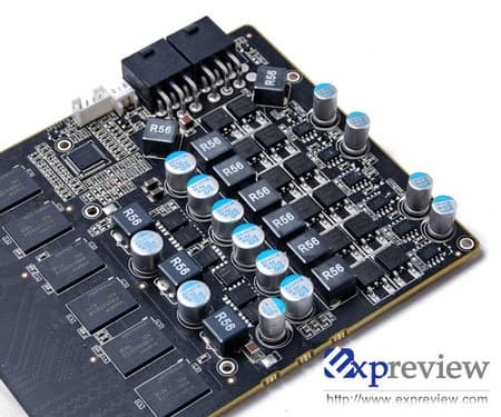 Частоты GPU/шейдеров/памяти равны 648/1476/1242 МГц. Система питания — 6+3-фазная, на Infineon MOSFET. На плате имеется два 6-контактных разъема, под ними расположены два фильтра, они должны обеспечить стабильное питание плате.