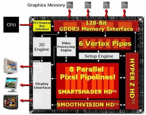 Компания ATI Technologies представила линейку графических процессоров RADEON X700, которые обладают всеми функциями линейки RADEON X800, но при более низкой производительности: 8 пиксельных конвейеров и 6 вертексных конвейеров (713 млн. трансформаций полигонов в секунду, 5,7 млрд. операций вершинных шейдеров в секунду). Как отмечается в пресс-релизе, линейка процессоров включает в себя модели RADEON X700 XT, RADEON X700 PRO, RADEON X700.