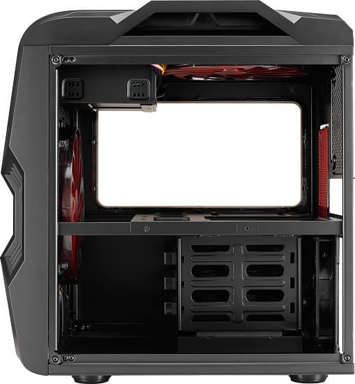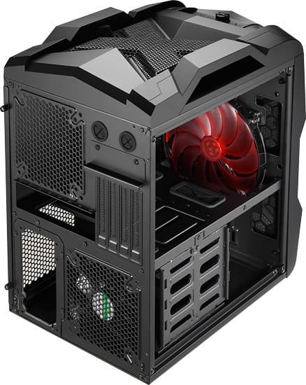 Strike-X Cube поддерживает установку трех накопителей типоразмера 2,5 или 3,5 дюйма, а также оптического привода типоразмера 5,25 дюйма. На тыльной панели корпуса — четыре прорези для вывода плат расширения и круглые отверстия для трубок системы водяного охлаждения.