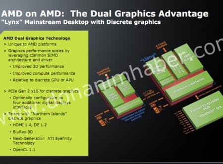 APU Llano — часть платформы AMD Lynx. В конфигурацию Llano входит два ядра x86-64 с новейшими SIMD-расширениями, GPU с поддержкой DirectX 11, двухканальный контроллер памяти DDR3, корневой концентратор PCI-Express 2.0 и интерфейс для взаимодействия с чипсетом Hudson M1. Для подключения дискретной 3D-карты APU имеет интерфейс PCI-Express 2.0 x16, которому можно придать другие конфигурации.