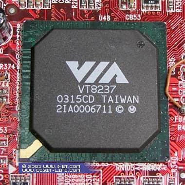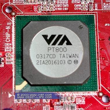 Вкратце – о VIA PT800: чипсет, ранее называвшийся в роадмэпах компании как PT400, поддерживает процессоры P4 с 800 МГц FSB, одноканальную память DDR400. По предварительным данным, будет комплектоваться южными мостами VT8235 или, как в данном случае, более современным VT8237.